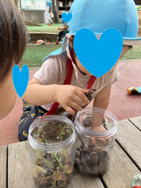 散歩先ではどんぐりや松ぼっくりなどの自然物を散歩バックに入れて集めたり「よー(い)どん」とかけっこや遊具で遊ぶ姿も見られるように。