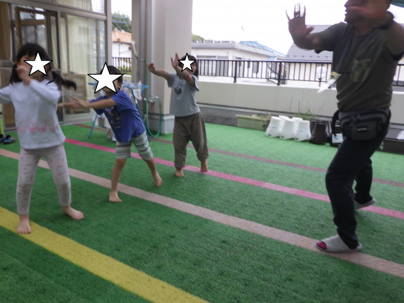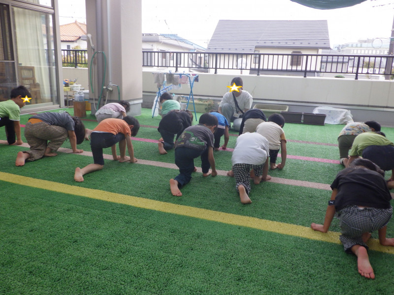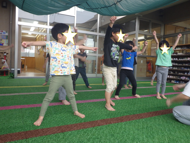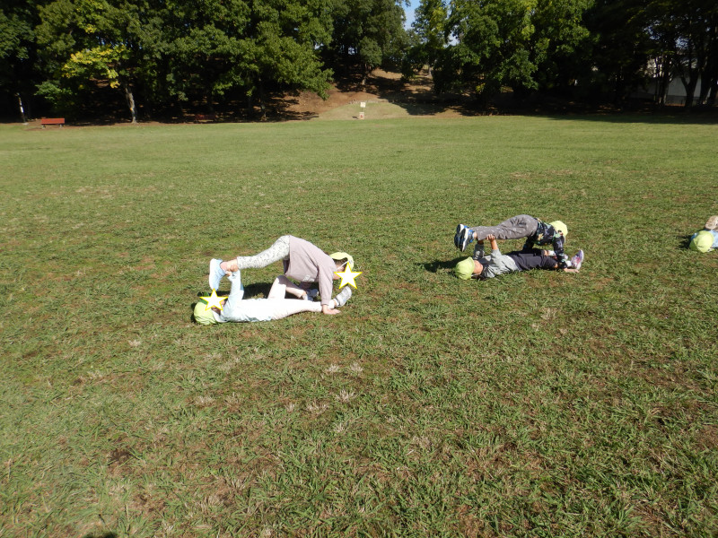 ひまわり組(4歳児)は広い公園でも組体操で身体を鍛えております。表情も真剣。