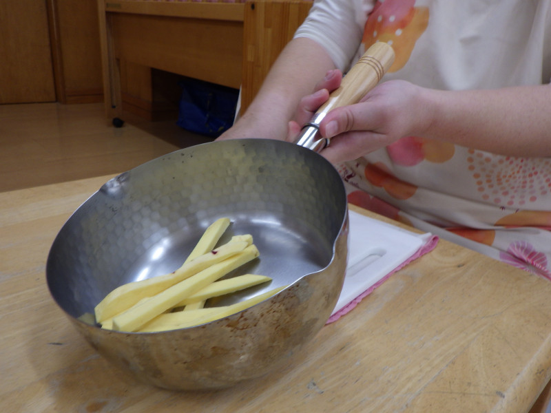 帰ってからは、栄養士に“ふかしいも”を作るところを見せてもらいます。