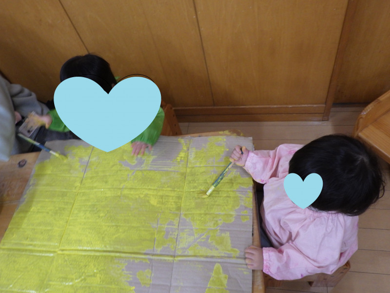 日々の活動で体験していたからか、少しずつ絵の具の感触にも苦手意識がなくなり、筆や手を使って黄色く塗りつぶします。後は扉をつけたら完成!